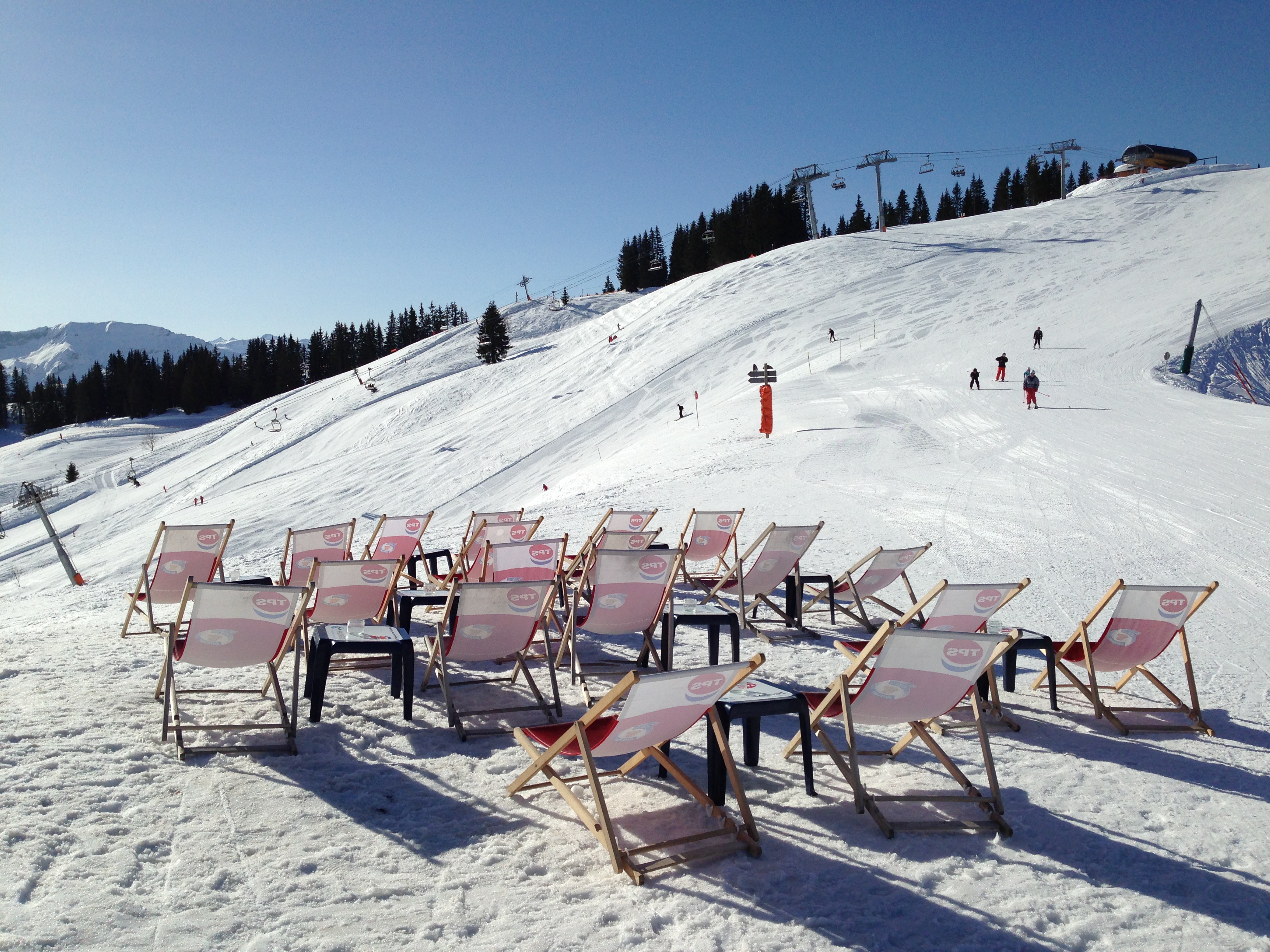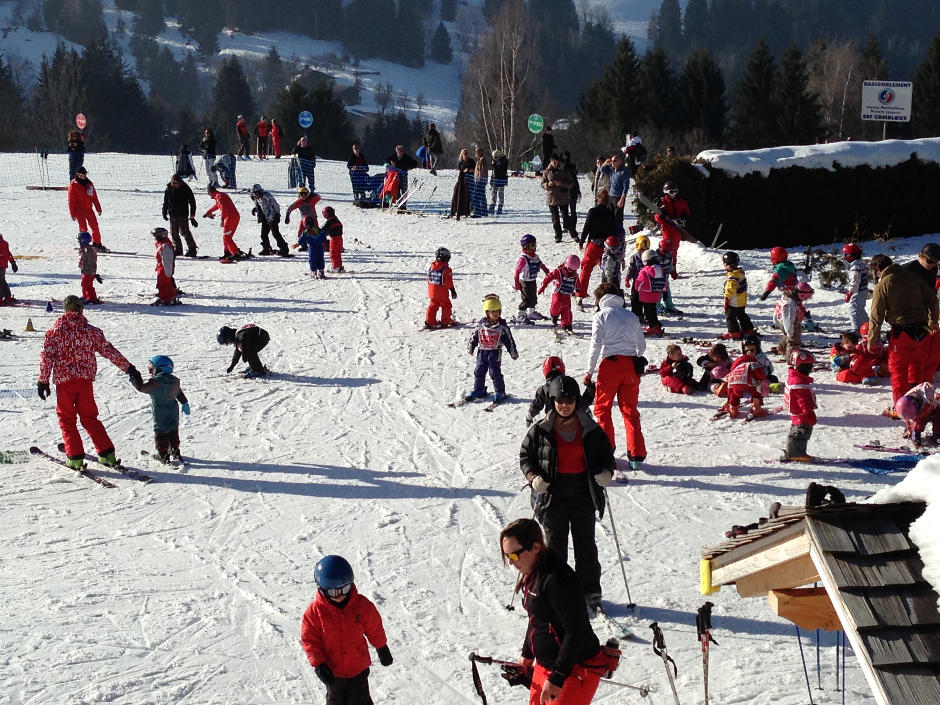 So at last Combloux sees some more people on the slopes. This is a big gathering place at the top of three chairlifts from where people head back down in all directions. They draft in maybe 3 or 4 times the number of instructors that they have the rest of the season, to soak up all those wanting lessons. The easier pistes are full of snaking lines of skiers trying, usually unsuccessfully by the third or fourth in line, to follow where the instructor goes and what they say to do.