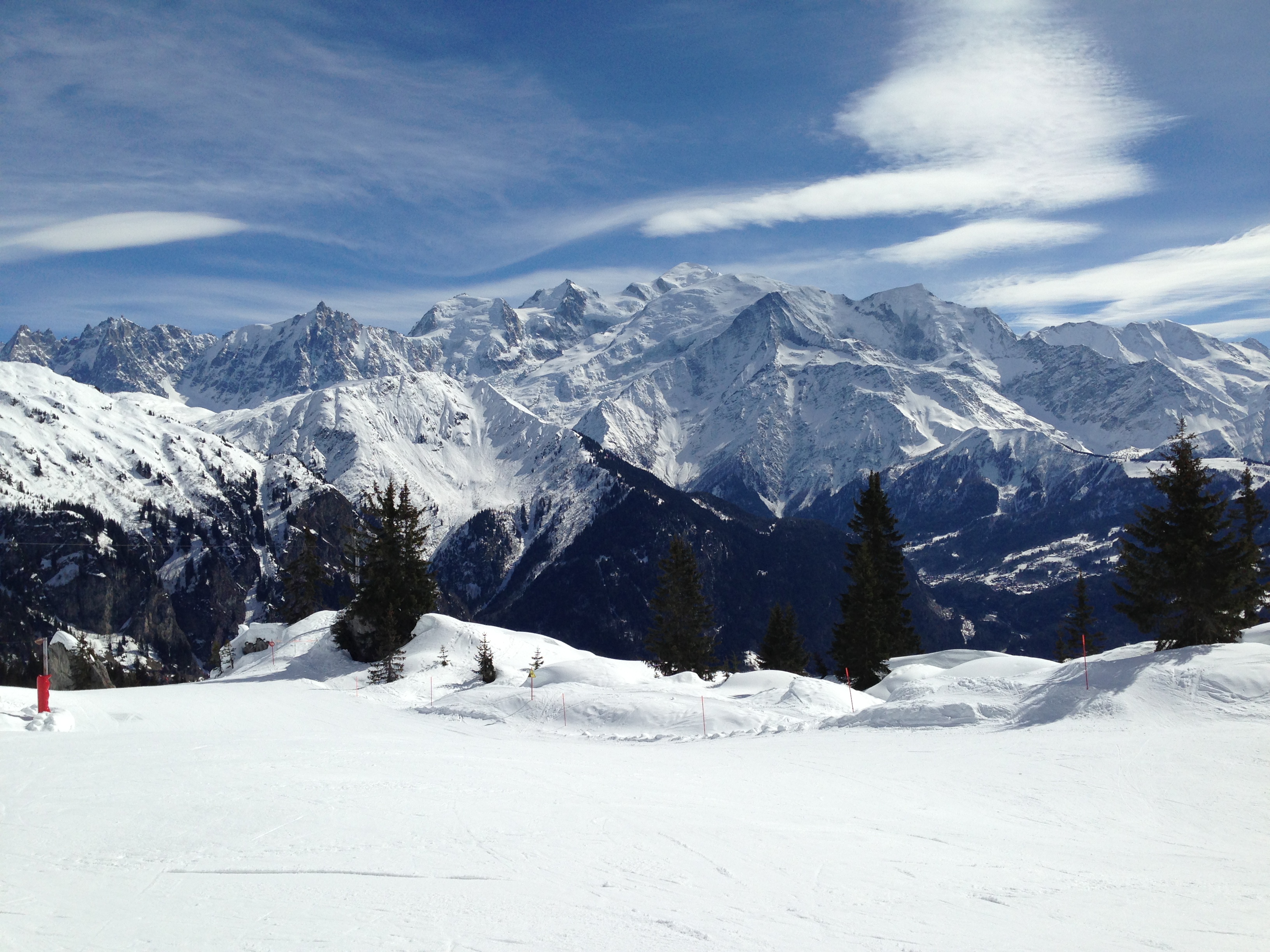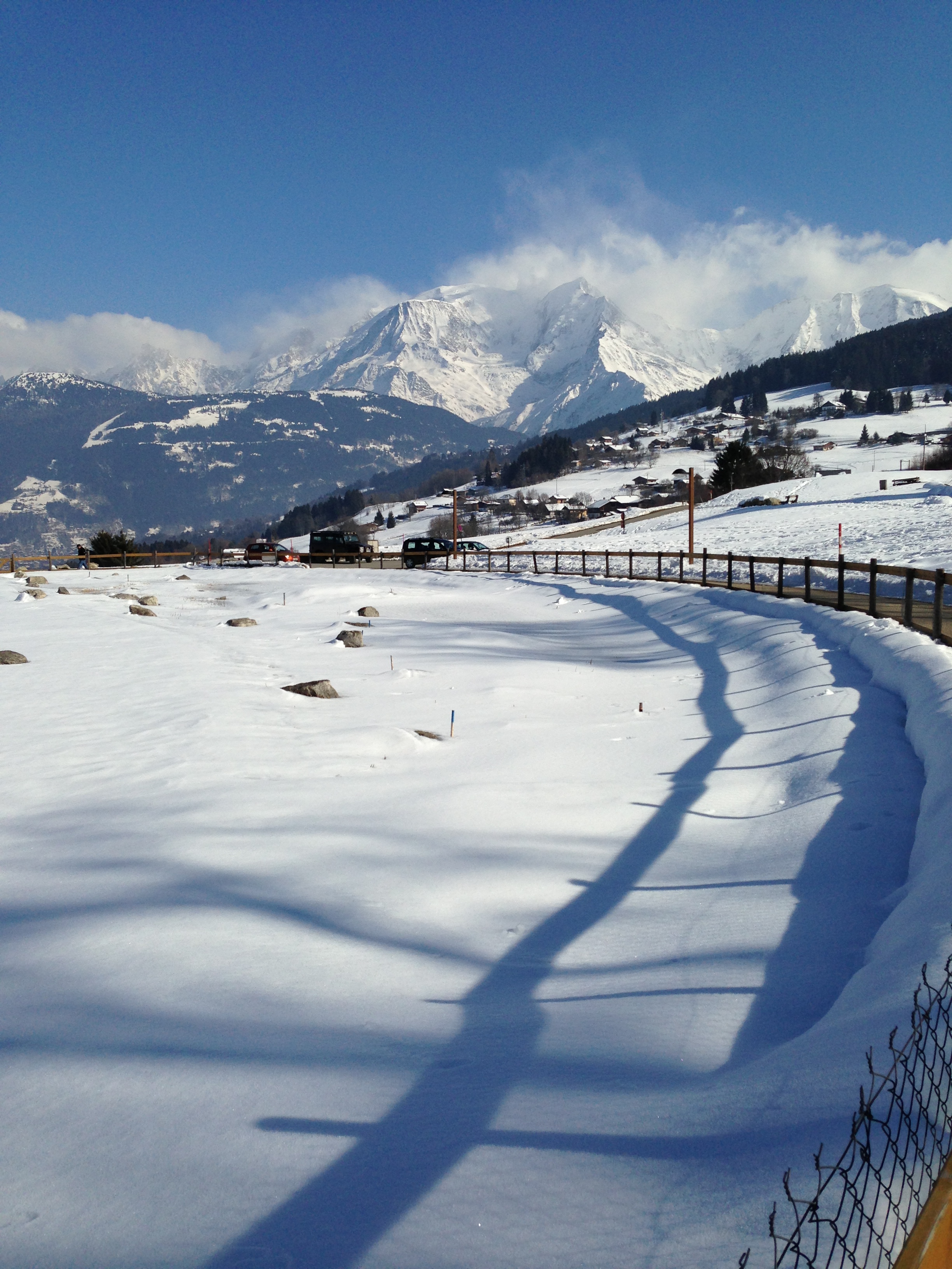 Great day in the sunshine though with plenty of cloud in the afternoon. From a piste on Christomet, you can see almost all of Megeve town. This is the view that you see in the brochures, so you think you can see Mont Blanc from the town but it’s tucked in too close to the much smaller Mont d’Arbois for that.