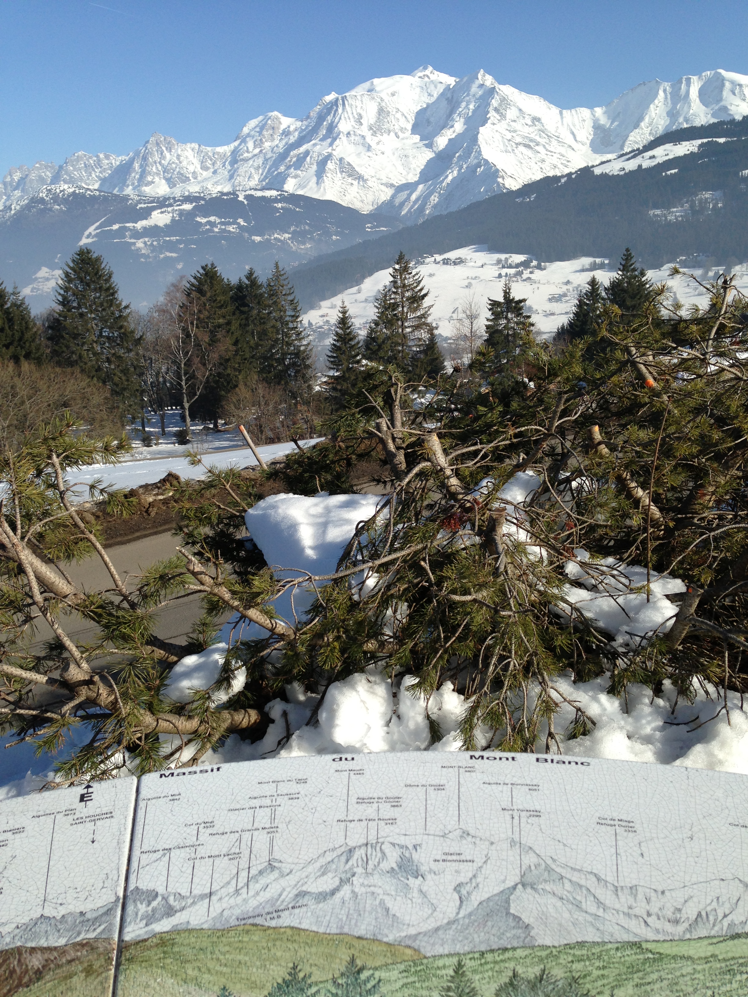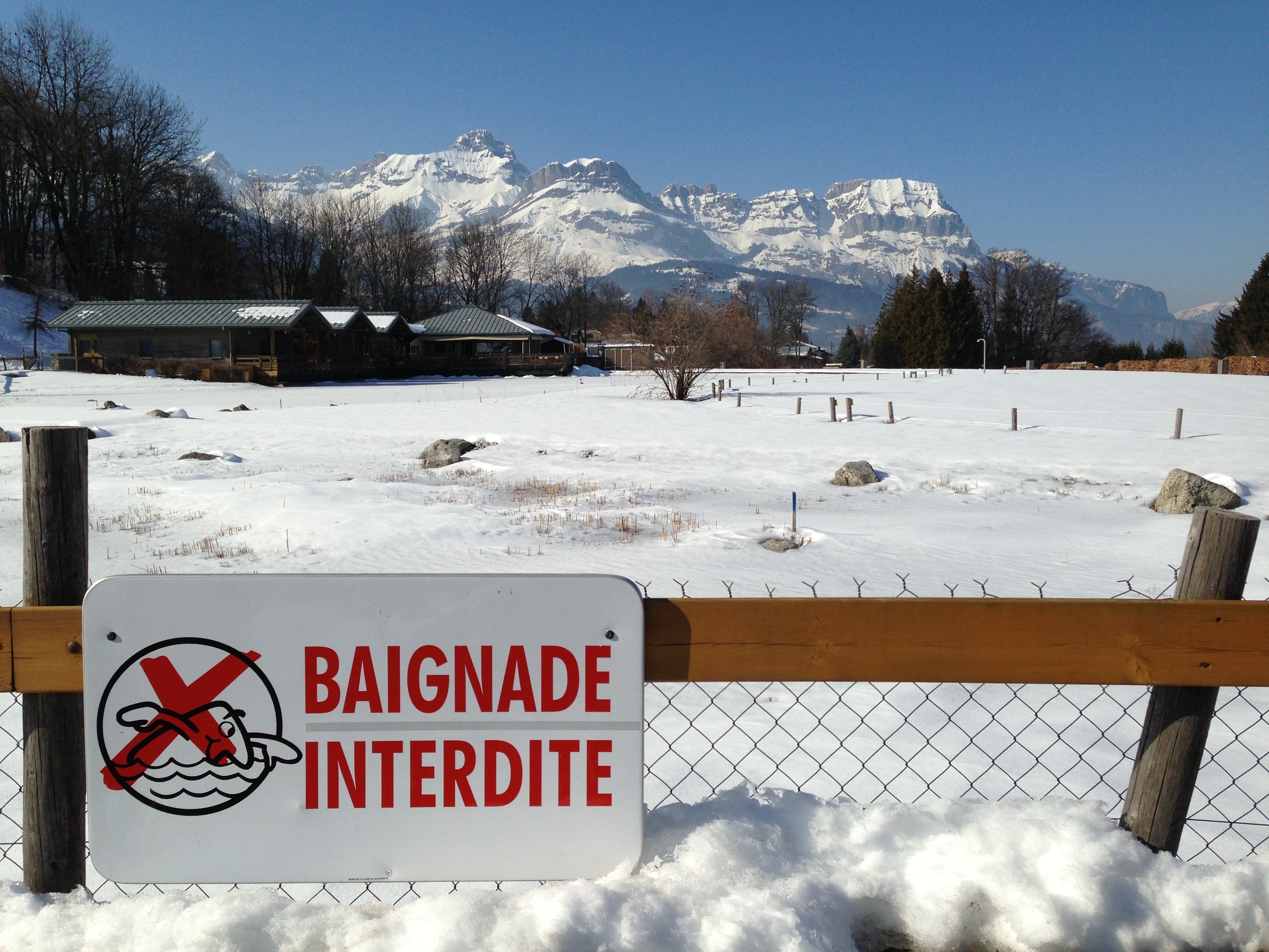 This is the current state of the ‘ecological lake’ at Combloux. This is a small artificial lake just below the village that cleans itself by natural filtration, apparently. Anyway even when it’s not completely frozen over and covered in snow, on this side of it, the water is still only a foot or so deep, and has reeds, poles and bushes sticking out of it, so you’d be a bit silly if you attempted a swim here. Still, best to put a sign up just in case.